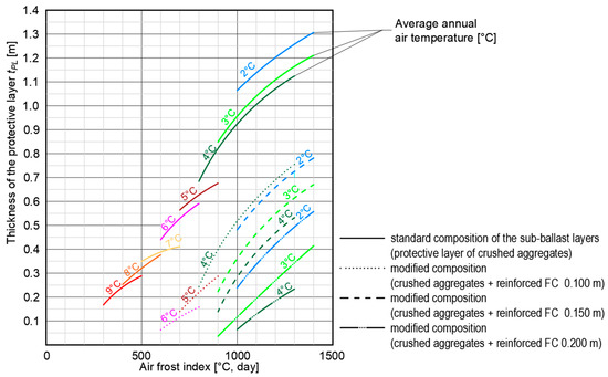 The article aims to present the modified structural composition of the sub-ballast layers of the railway substructure, in which a part of the natural materials for the establishment of sub-ballast or protective layers of crushed aggregate is replaced by thermal insulation and reinforcing material (layer of composite foamed concrete and extruded polystyrene board). In this purpose, the experimental field test was constructed and the bearing capacity of the modified sub-ballast layers’ structure and temperature parameters were analyzed. A significant increase in the original static modulus of deformation on the surface of composite foamed concrete was obtained (3.5 times and 18 times for weaker and strengthen subsoil, respectively). Based on real temperature measurement, it was determined the high consistency of the results of numerical analyses and experimental test (0.002 m for the maximum freezing depth of the railway line layers and maximum ±0.5 °C for temperature in the railway track substructure–subsoil system). Based on results of numerical analyses, modified railway substructure with built-in thermal insulating extruded materials (foamed concrete and extruded polystyrene) were considered. A nomogram for the implementation of the design of thicknesses of individual structural layers of a modified railway sub-ballast layers dependent on climate load, and a mathematical model suitable for the design of thicknesses of structural sub-ballast layers of railway line were created.
