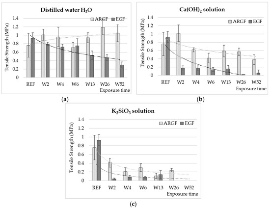 Strengths of ARGFs and EGFs (average value of 10 measurements at minimum, excluding outliers) after treatment in a neutral environment: (a) H2O and alkaline environments, (b) Ca(OH)2, and (c) K2SiO3 solutions depending on exposure time (x-axis, in weeks). The dotted lines in the graphs indicate the trend lines.