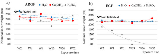 Nominal weights (tex) of (a) ARGFs and (b) EGFs treated in H2O, Ca(OH)2, and K2SiO3 according to the exposure time. The points represent the measured values for the nominal weight, and the lines represent the trend lines. The nominal weights of the reference samples were (a) 2800 tex for the ARGFs and (b) 2375 tex for the EGFs.