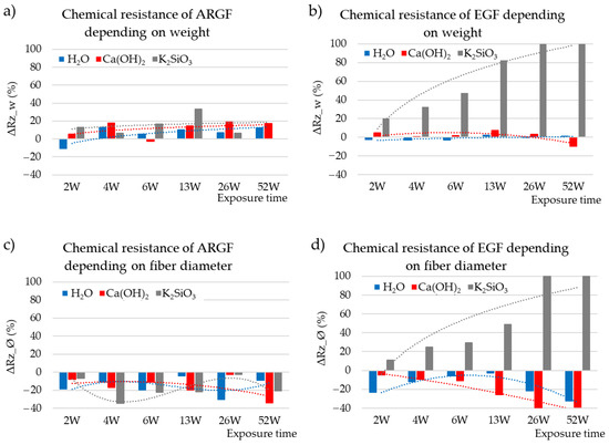 Chemical resistances of (a) ARGFs and (b) EGFs depending on weight (ΔRz_w (%)) and chemical resistances of (c) ARGFs and (d) EGFs depending on fiber diameter (ΔRz_Ø (%)).