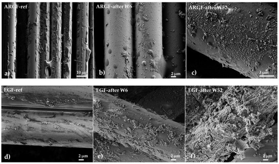 Figure 4 shows the surfaces of the ARGFs during the experiment. ARGFs have an organosilane-based coating (sizing) to protect them from corrosion in an alkaline environment, which keeps them in the same shape for as long as possible. Figure 4b shows the ARGF in Ca(OH)2 after W6. The fiber surface is smooth and intact, whereas the sizing has formed disordered clusters, irregularly distributed over the fiber surface and in the inter-fiber space. Figure 4c shows the ARGF in Ca(OH)2 after W52. Calcium compounds formed by the fiber reacting with Ca(OH)2 have settled on the fiber surface, but there are no holes or cracks. Figure 4b shows the surfaces of EGFs in Ca(OH)2. Figure 4e shows the EGF in Ca(OH)2 in W6 when the first incrustations appeared on the fiber surface. Over time, the occurrence frequency of incrustations increased, and they gradually formed a continuous layer. Figure 4f shows EGF in Ca(OH)2 in W52, at which time the corrosion shell had broken and was slowly being torn off.