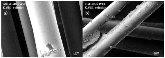 Figure 5a shows the surface of the ARGF in K2SiO3 at W52. The fiber surface is smooth without cracks and holes, and no partial or continuous incrustations can be observed. Figure 5b shows the surface of the EGF in K2SiO3 at W13 (the maximum time when the fibers were still observable). Incrustations of minor and more significant dimensions can be identified on the fiber surface. After W13, the EGFs completely dissolved. Thus, the EGFs had negligible resistance against an alkaline environment.