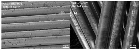 Surfaces of glass fibers treated with distilled water: (a) ARGF after W52, and (b) EGF after W52.