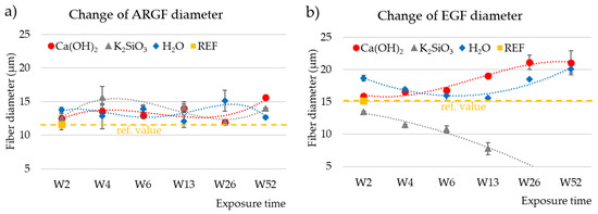 Figure 7a graphs the change in diameter of the ARGFs in H2O, Ca(OH)2, and K2SiO3. The reference samples had an average fiber diameter of 11.62 ± 0.8 µm. In both alkaline solutions (Ca(OH)2, K2SiO3), the fiber diameter increased by 1 µm at the beginning of the experiment (W2), and it increased by 2 µm in H2O (W2). The increase in diameter can be attributed to the action of water, which was present in all solutions. A high-silica layer formed on the fiber surface [20]. The diameter of the H2O-treated fibers oscillated around 12 µm for the rest of the experiment. The diameter of the Ca(OH)2-treated ARGF fibers increased to 13–15.64 µm during the experiment with a slowly increasing trend line. The K2SiO3-treated fibers reached a maximum fiber diameter of 15.65 ± 1.63 µm in W4, and the fiber diameter decreased during W6–W26 to 11.94 ± 0.03 µm before increasing to 14.02 ± 0.02 µm in W52. The trend line showed a slow decrease.