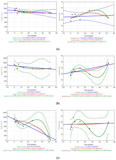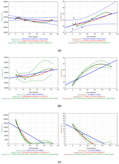 For the EGF in H2O (Figure 9a), only the linear trend (blue line) may predict the changes in the fiber weight and diameter over time (rate of weight loss was 2.57 × 10−5 g/day; rate of diameter increase was 0.01 µm/day). These results show that the ARGFs lost weight at a rate about eight times slower than EGFs, and the diameter increased at a rate about seven times slower than EGFs. The EGF in Ca(OH)2 (Figure 9b) showed that both the quadratic and cubic trends were suitable for predicting the changes in weight and diameter over time. The same results were observed for the EGF in K2SiO3 (Figure 9c). However, the weight loss over time could also be predicted by using a linear trend (i.e., it corresponded to the change in diameter).