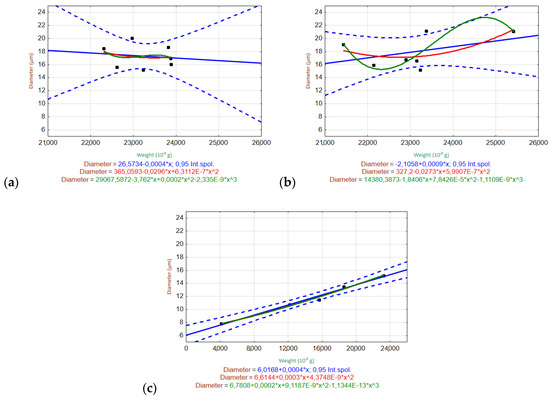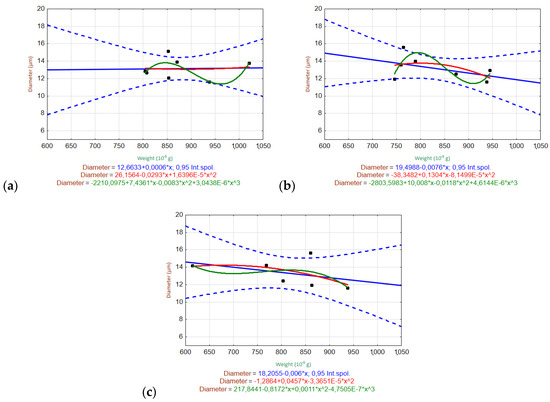 Figure 10 and Figure 11 show the scatter plots used to evaluate the relationships between the weight and fiber diameter within the given measurement ranges for the tested solutions (H2O, Ca(OH)2, K2SiO3). The measured data are plotted as black dots, and the interpolated relationships are shown as blue (linear), red (quadratic), and green (cubic) lines. The regression equations are listed in the graphs. The regression bands are shown as dashed lines with the same corresponding color at a confidence level of 0.95. For clarity, only one confidence interval is displayed (the one for the most appropriate trend).