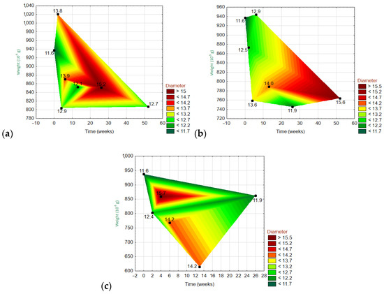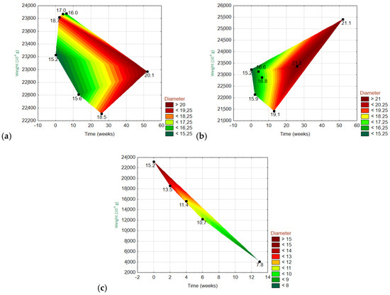 Three-dimensional wafer plots showing the dependencies of the three variables (diameter, weight, and time) for ARGFs treated with different solutions: (a) H2O, (b) Ca(OH)2, and (c) K2SiO3 (bottom).