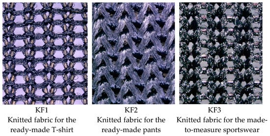 All three materials are a single weft-knitted fabric and contain a high percentage (20–26%) of elastane fibers. The structure of the knitted fabrics used is shown in Figure 1. The knitted structure with integrated elastane yarn ensures large-scale, multiaxial elastic deformation for the fabrics. In addition, the polyester (PES) and polyamide (PA) fibers provide strength and abrasion resistance and quickly wick sweat away from the body and allow it to evaporate, as they can retain very little moisture.
