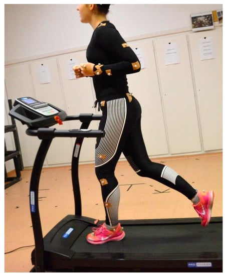 We performed the tests every morning at the same time. The test girls ran on the treadmill wearing another sports suit once each day. Figure 2 shows one of the test subjects in the Ready-made Sportswear while running on the treadmill, with the markers necessary for the movement tests.
