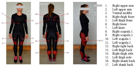 We measured the compression of sportswear on the test person’s body with the PicoPress tester at 17 points on the body (Figure 3).
