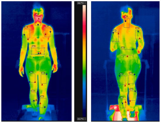 From the clothing physiology point of view, the critical parameter is the thermal load on the subject during running. For this purpose, the body surface temperature was recorded with a FLIR A325sc thermal imaging camera (FLIR Systems, Wilsonville, OR, USA) (Figure 4).