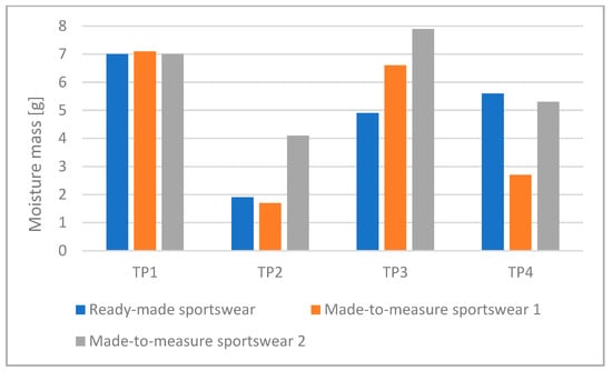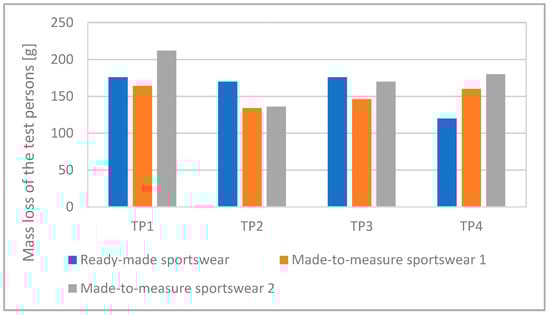 The moisture absorbed by Made-to-measure Sportswear 1 and 2 can be compared well because they were made of the same fabric and the only difference between them is in compression (Figure 6). The higher compression Made-to-measure Sportswear 2 absorbed far more moisture than the lower compression Made-to-measure Sportswear 1 in the case of three test persons (TP2, TP3, and TP4), while in the case of Test Person 1, the two values were nearly identical. The higher compression Made-to-measure Sportswear 2 caused a higher reduction in body mass than the lower compression suit in the case of three test persons (TP1, TP3, and TP4), while with Test Person 2, both sports suits resulted in nearly identical body mass loss (Figure 5). These results indicate that higher compression generated more sweating.