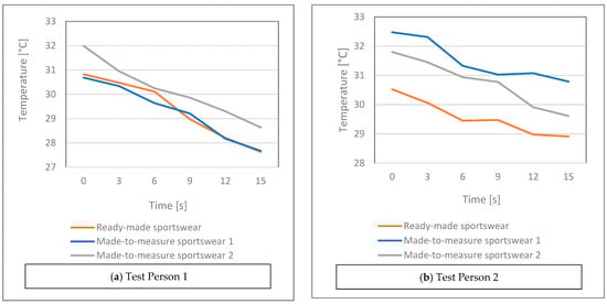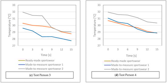Figure 7a–d shows the average body surface temperatures as a function of time for each test person and sports suit. As time passes, the average temperature decreases, due to the more intensive sweating, as the evaporating sweat and the moving air caused by running take heat away. The test persons stopped after 15 min.