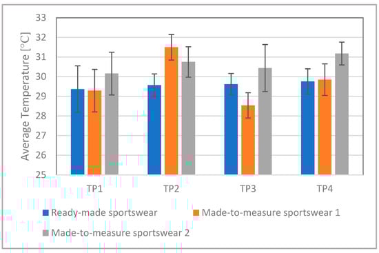 For better comparison, Figure 8 shows the average body surface temperature calculated for the whole running period. While wearing the higher compression Made-to-measure Sportswear 2, three test persons (TP1, TP3, and TP4) had a higher body surface temperature during running than in the case of the lower compression Made-to-measure Sportswear 1. In the case of Test Person 2, the opposite was true. These results indicate that higher compression generated higher body surface temperature.