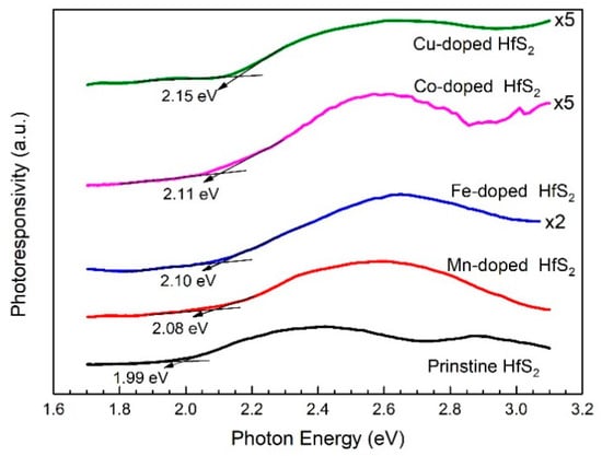 Photoconductivity spectra of the pristine, Mn-, Fe-, Co-, and Cu-doped HfS2 crystals.