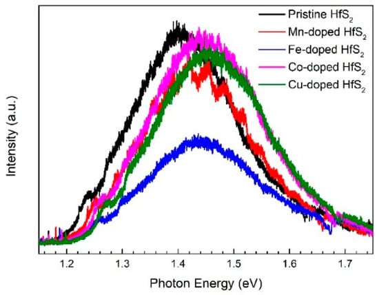 Photoluminescence spectra of the pristine, Mn-, Fe-, Co-, and Cu-doped HfS2 crystals.