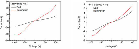 Current-voltage curves of (a) the pristine and (b) the Co-doped HfS2 crystals.