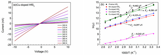 To understand the relationship between the conductivity and temperature, I-V curves of each sample at various temperatures were constructed. Figure 6a shows the results for Cu-doped HfS2. Under a given bias voltage, the current of the Cu-doped HfS2 crystal increased as the temperature increased, and the temperature-dependent I-V curves of the other samples exhibited similar behaviors. This phenomenon resulted from the increase in carrier concentration with the increase in temperature, leading to a decrease in the resistivity of the samples.
