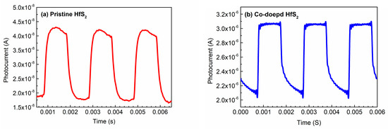 Photocurrents of (a) the pristine and (b) the Co-doped HfS2 crystals as a function of time under an illumination frequency of 500 Hz.