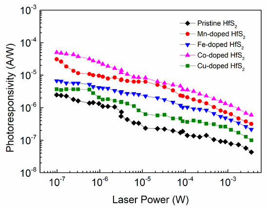 Photoresponsivity of the pristine, Mn-, Fe-, Co-, and Cu-doped HfS2 crystals as a function of laser power.