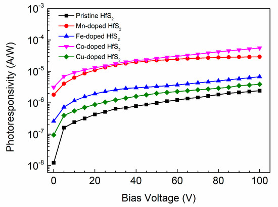 Photoresponsivity of the pristine, Mn-, Fe-, Co-, and Cu-doped HfS2 crystals as a function of bias voltage.