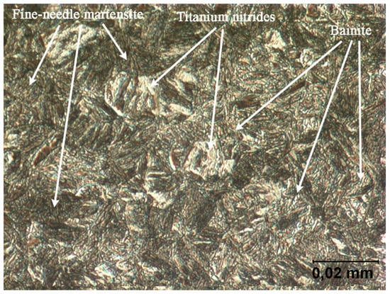 On the basis of microscopic observation, it was concluded that the ARMOX 500T structure consists of fine needle tempered martensite with a small amount of bainite (see Figure 2). Moreover, local precipitation of titanium nitrides was observed in the structure, the content of which is not included in the manufacturer specification.