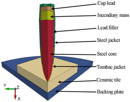 In the literature there are many examples of using of numerical methods for the analysis of highly dynamic phenomena. Computer programs such as LS-DYNA, ABAQUS, ANSYS AUTODYN, etc. [24,25] are commonly used to assess the ballistic effectiveness of ceramic and composite armor. In [26], in the example of 7.62 × 54 R mm B32 armor-piercing incendiary (API) projectile impact, the process of impactor energy dissipation was analyzed using the finite elements method (FEM) implemented in the LS-DYNA code. In [27], the phenomenon of 7.62 × 51 mm armor-piercing (AP) (M61) projectile-firing was described using a hybrid method combining Lagrange and Euler formulations—Arbitrary Lagrangian Eulerian (ALE). In [28], the impact of a 7.62 × 39 mm FMJ M43 projectile on composite armor reinforced with α-AL2O3 particles was realized using the approach based on combining FEM and SPH methods implemented in ABAQUS software.