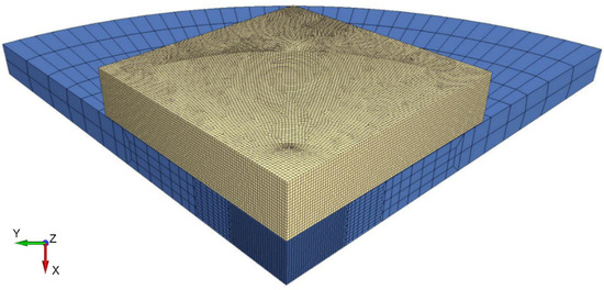 The discretization of the layered armor model is shown in Figure 7. Thanks to the use of two symmetry planes, only a quarter of the armor was modeled, which limited the number of elements and accelerated the calculations.
