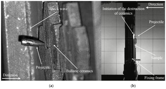 The course of the process of the projectile impact into the ceramic/steel composite armor: (a) the moment when the projectile is captured; (b) the projectile’s contact with ceramics.
