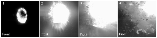 As shown in Figure 8a, the 7.62 × 39 mm API(BZ) projectile was captured at the moment of contact with the ceramic layer. During this shot, laser illumination was used and the camera was set at a certain angle, giving the wrong impression that the projectile did not maintain a 90° angle to the vertical axis of the specimen clamps. A shock wave front (characteristic Mach cone) was recorded. In Figure 8b, the image is shown as recorded perpendicular to the firing line of the sample. On the basis of the shadow photo, only the glow of the API(BZ) projectile can be seen. Around the glow of the projectile, a characteristic ring formed by the incendiary masses initiated is visible. Its flare in later stages of the penetration process makes it difficult to register the course of the phenomenon using a high-speed camera (see Figure 9). Figure 9 shows how, in step 1, a characteristic flash caused by the incendiary mass initiation could be seen. In step 2 the flash is intensified and then, in steps 3 and 4, only the poorly visible dispersion of fragments of destroyed ceramic can be noticed. However, in the final stage of the phenomenon, the degree of fragmentation of the ceramic tile can be seen—it crumbled into many small fragments. The quality of the shot recording is much worse in this case, because halogen backlighting was used. The photographic recording of the intensity of the ceramic tile fragmentation enabled subsequent quantitative verification of the simulation results.