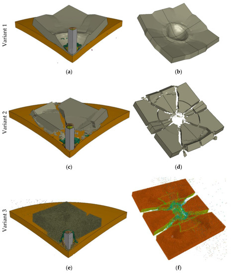 The calculations were carried out on 7 cores with 3.2 GHz clock and 10 Gb of operating memory. It is clear that introducing SPH particles into the model significantly slows down the calculations (calculation time about 10× longer). Taking into account the quality of the reproduction of the phenomenon, the hybrid method (variant 4 —conversion of finite elements to SPH particles) gives the best results and should be used in cases where accurate results are required. In other situations, where the purpose of calculations is not to determine, for example, the exact extent of penetration depth, but only to observe a certain trend, the FEM method with defined erosion criteria (variant 2), which is more than 10× faster, can be considered for use.