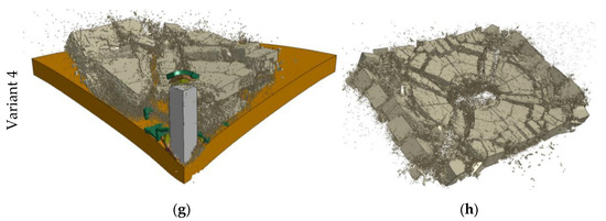 Thanks to the application of the hybrid method (finite elements converted into SPH particles after exceeding defined failure criteria), the following key physical phenomena occurring during the penetration of armor containing ceramic tiles (see Figure 10g,h) with AP projectiles were reproduced: