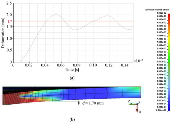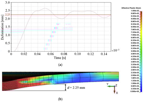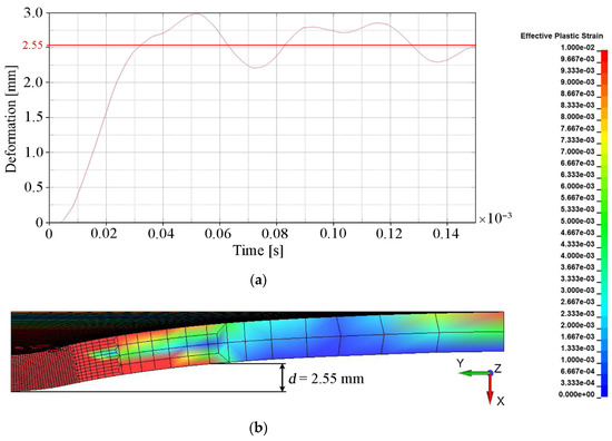As a result of finite element erosion, a significant mass of the ceramic tile is removed. This does not allow effective reproduction of the mechanisms of projectile resistance in the ceramic tiles and, consequently, the effectiveness of the ceramics in projectile resistance was thus underestimated. The results closest to the real ones were estimated for variant 4 (see Figure 14), where a deformation value of 2.55 mm was obtained.