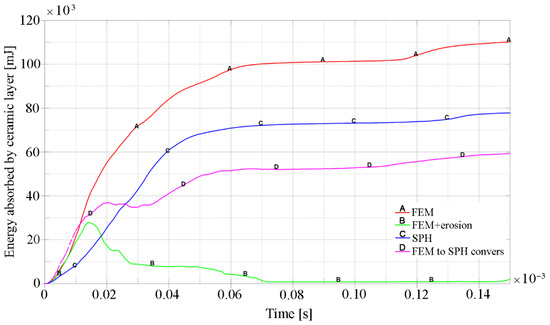 The conclusions drawn from the deformations of the backing plate were confirmed also by the graph showing the energy absorbed by the ceramic tile as a function of time for different techniques of ceramic tile modeling (see Figure 15).