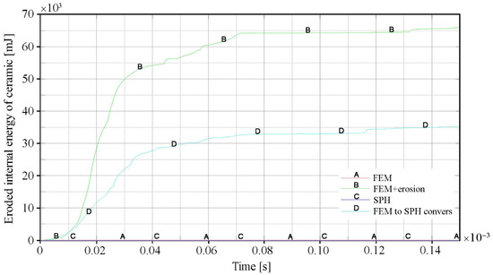In Figure 16, the change in the amount of eroded internal energy inside the ceramic tile over time is shown. For variants 1 (FEM) and 3 (SPH), the amount of this energy was equal to zero because erosion algorithms were not used. In variant 4 (FEM to SPH conversion) the number of elements is over two times lower than in variant 2 (FEM with erosion). In addition, in variant 4, the eroded elements were replaced by SPH particles, so the protective effectiveness of the ceramic tile was not artificially underestimated by erosion.