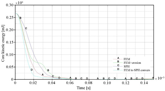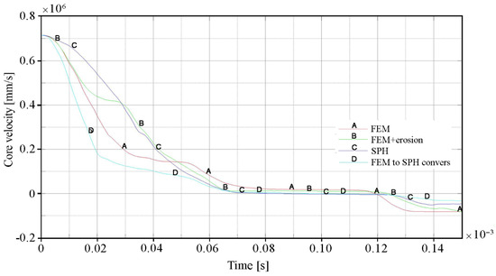 The influence of the erosion algorithm on the penetration process of ceramic/steel composite armor is also clearly visible in Figure 17 and Figure 18, where the changes in kinetic energy and velocity of the projectile core in time are shown respectively. The curves for variant 2 of the calculation (FEM with erosion) have a characteristic stepped shape. This was a result of the increase in stress and, as a consequence, premature excessive erosion of a certain volume of the ceramic tile located in the area of direct impact in the projectile tip. Therefore, during the period t = 0.02 ÷ 0.04 × 10−3 s, the projectile was not decelerated and moved at a relatively constant velocity. Further deceleration occurred only after interaction with the backing plate had started. The curve patterns of the other calculation variants were much more similar to the real one. Figure 17 and Figure 18 clearly show that the most intense deceleration of the projectile occurred in variant 4 (FEM to SPH conversion). The curve for Variant 3, in which the ceramic tile was modelled with SPH particles, has the smoothest shape. However, in this case, this was not due to the lowest protective effectiveness of the ceramic tile, but only to the most intense destruction and erosion of the projectile core.