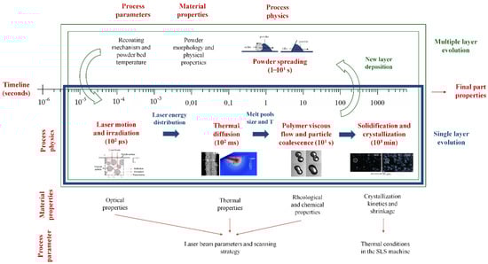 The solid filled and hollow shapes (arrows and rectangles) highlight the production of a single layer and the fabrication of multiple-layer parts, respectively. The horizontal timeline describes the evolution of a single layer that moves down in z-direction during the running sintering process. The circle path illustrates what occurs when a powder layer is deposited and then the laser is applied; these steps are repeated layer-by-layer until the end of the printing job. This scheme also outlines the relationship between the physical phenomena involved in polymer SLS, the properties of the raw materials, and process parameters. [,]. The latter take into account the properties of the laser source, the laser energy input, and other machine-specific characteristics such as the heating system of the build chamber and the recoating mechanism employed. The starting powders suitable to be processed by SLS need to be characterized in terms of optical, thermal, rheological, and physical properties. A detailed investigation of the SLS process by considering the influence of different parameters can be useful to obtain preliminary selection criteria for the evaluation of a new material.