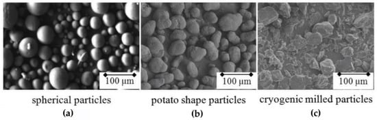 Particle shapes obtained by different production methods: (a) spherical, (b) potato-shaped, and (c) cryogenically milled particles. Reproduced with permission from [].