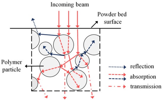Laumer et al. [] specifically designed an experimental set-up to investigate the optical material properties of polymer powders for SLS. The set-up was based on a double integration sphere that allowed the researchers to simultaneously measure the diffuse and direct reflectance, as well as the transmittance, of polymer powders for a CO2 laser source. The results showed that polyamide 12 (PA12) powders reflected only 5–6% of the incoming laser energy at the bed surface, yielding an absorption coefficient of 0.94. In contrast, the reflectance of polyethylene (PE) powder was significantly higher (30%). A detailed explanation model that took into account the optical properties of the bulk polymer and the multiple reflections within the powder bed was proposed to explain this difference (Figure 4).