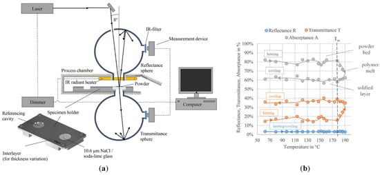 (a) Scheme of the integration-sphere measurement setup with a heated process chamber; (b) temperature-dependent optical properties of PA12 powder during CO2 laser exposure (layer thickness = 150 μm, laser wavelength = 10.6 μm). The heating and cooling cycle are outlined by arrows in all recorded curves. The dashed line at 182 °C corresponds to the PA12 powder’s melting temperature. Reproduced with permission from []; adaptation in (b).