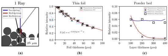 (a) Ray-tracing model describing the propagation of a photon through the powder bed; (b) relative transmission in PA12 thin foils as function of thickness; (c) comparison between the simulation results and experimental data for the relative transmission and reflection of a PA12 powder bed. Adapted from [].