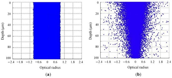 Simulation results of photon propagation inside a polymeric powder bed: (a) radiative model without scattering (the laser was considered a volumetric heat source, as proposed by Defauchy []); (b) Monte Carlo method with scattering. Reproduced with permission from [].