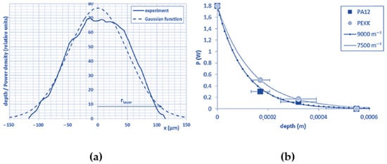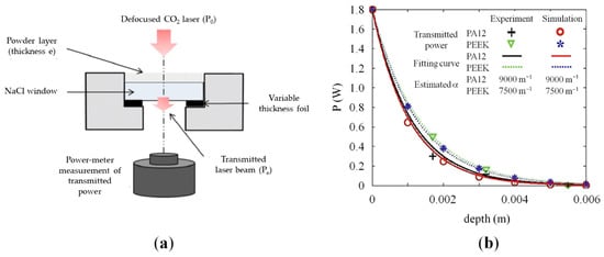 The experimental results can be described using the Beer–Lambert equation (Equation (1)). A higher attenuation coefficient was obtained for PA12 (0.009 μm−1) compared to PEEK (0.0075 μm−1), leading to an effective penetration depth of 110 μm and 130 μm, respectively. It was also found that estimating a correct value for the attenuation properties of the powders was important to accurately determine the melt pool size and thermal cycles during laser irradiation [].