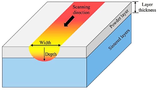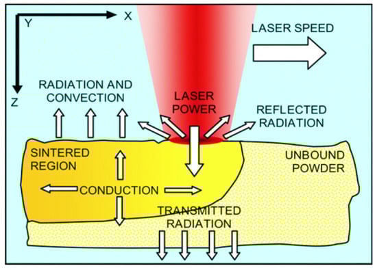 Therefore, unlike in continuum-based models, the relevant transparency of granular materials was taken into account. These results proved that the laser–powder interaction in SLS involved complex phenomena that occurred not only at the outer surface, but also through the volume of the powder bed (Figure 4) [,].