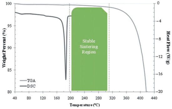 This behavior proves that the phase transitions of the polymer were responsible for these variations. In fact, the occurrence of melting led to fewer reflections between particles and lower scattering of the radiation on polyamide crystallites. Consequently, the transmittance increased from the initial value (16%) up to 35–40% after the melting point. During cooling, the melt solidified, and the orientation of the grown crystals produced an almost constant transmittance. Accordingly, the absorption was higher for the powder bed (80%) compared to the molten and solidified layer (61%) (Figure 5b). Furthermore, the authors studied the interaction of a short-wave radiation with the powders in order to provide insights on the development of an improved in situ optical monitoring system for AM technologies [].