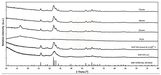 However, changes in the size of particles and agglomerates can be considered as small and insignificant. XRD (Figure 2) and SEM (Figure 1b) tests confirmed the preservation of the nanometric structure and above all the phase purity of the HAP NPs despite the increase in density. An XRD analysis of all HAP NPs and composites powders obtained was carried out. The diffraction patterns showed peaks from hydroxyapatite, indicating that it was a crystalline and phase pure material. The small increase in the width peaks for HAP NPs, as compared to HAP NPs, corresponds to a slight increase in hydroxyapatite grain size. For the PLLA and 25com samples, a peak appeared at account 16.4, i.e., from the polymer. For 25com, a peak was present but weakly undersized. The sizes of these peaks related to the degree of crystallinity of the polymer. The peak was not observed for the 50com and 75com composites, due to the high volume amount of nanoparticles in the polymer matrix.