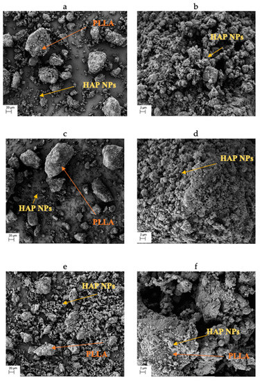 The obtained composite granulate after cryomilling has an irregular shape. Both HAP’ NPs agglomerates and PLLA granules are visible. It can be observed in the SEM images in Figure 3 that the increased quantity of HAP NPs is accompanied by a greater fragmentation and a smaller size of the PLLA granules, which contributes positively to the composite homogeneity. The 25com composite granulate (Figure 3a) is several times the size of the 75com granulate (Figure 3e). Moreover, HAP NPs aggregates are visible on the PLLA granule surface in all composites (Figure 3b,d,f) and a single aggregate has the size below 10 μm. PLLA granules were crushed below 100 μm and HAP NPs with a form of 10-μm aggregates.