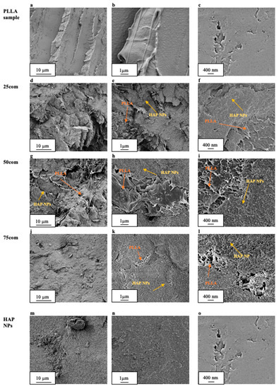 The composite microstructure changes depending on the composition, i.e., in our case, we observed changes because of the proportion of PLLA to HAP NPs. The volume content for the produced inverse nanocomposite is 25, 50, and 75%, respectively, and changes were observed on sample fractures after the warm isostatic pressing, which is presented in Figure 4d,l. Figure 4a,c present the fracture of PLLA sample, with different magnifications. As can be observed, the PLLA surface is smooth but brittle.