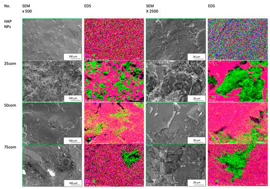 Collection of SEM images; EDS mapping for HAP NPs sample and 25com, 50com, and 75com composites.