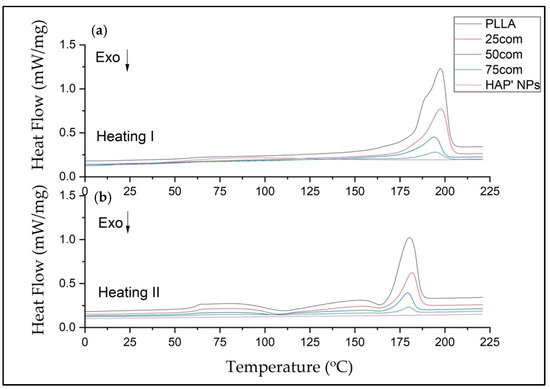 DSC thermograms of composites 25com, 50com, and 75com, as well as HAP NPs and PLLA samples, after first and second heating (a and b, respectively).